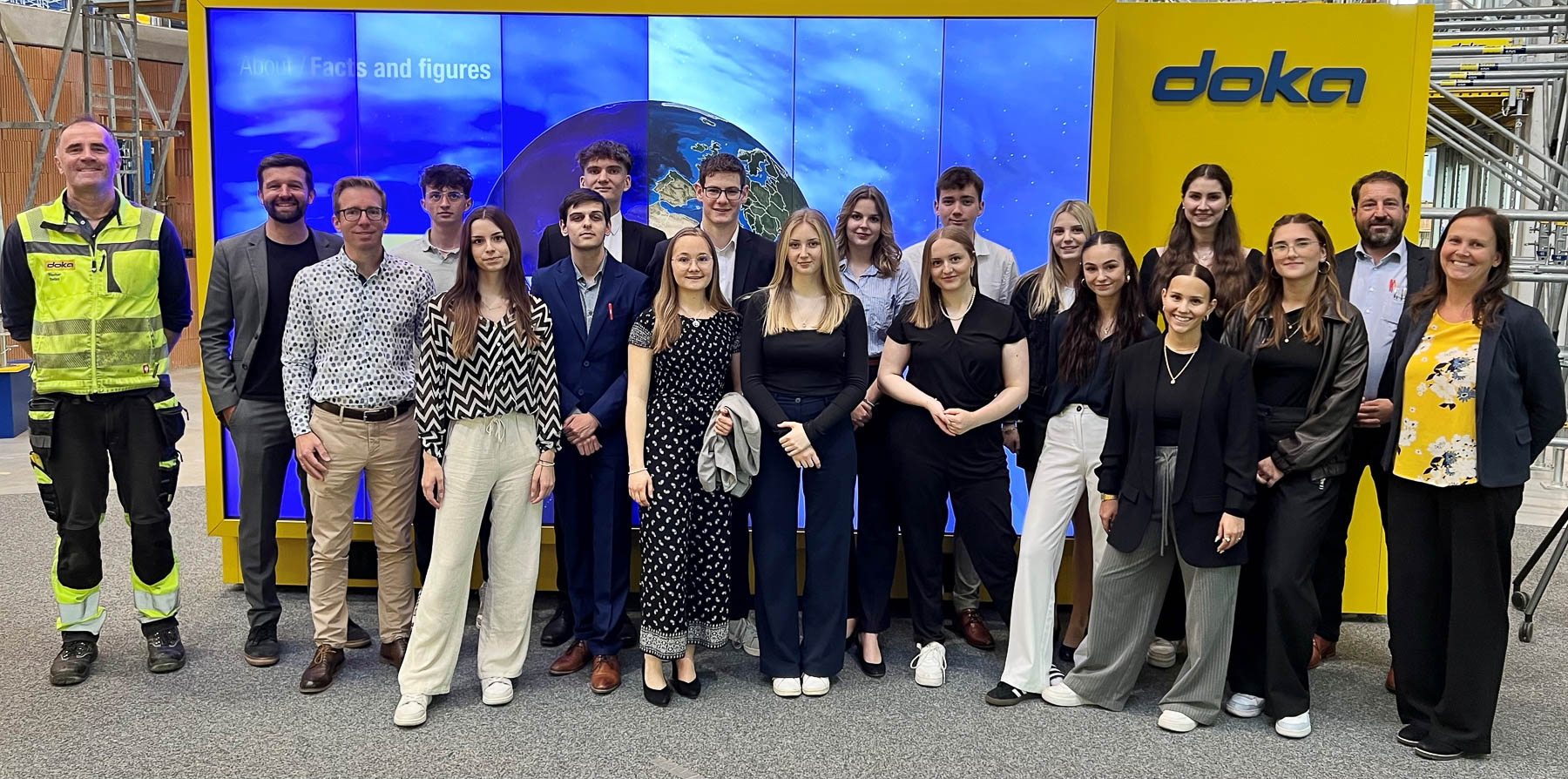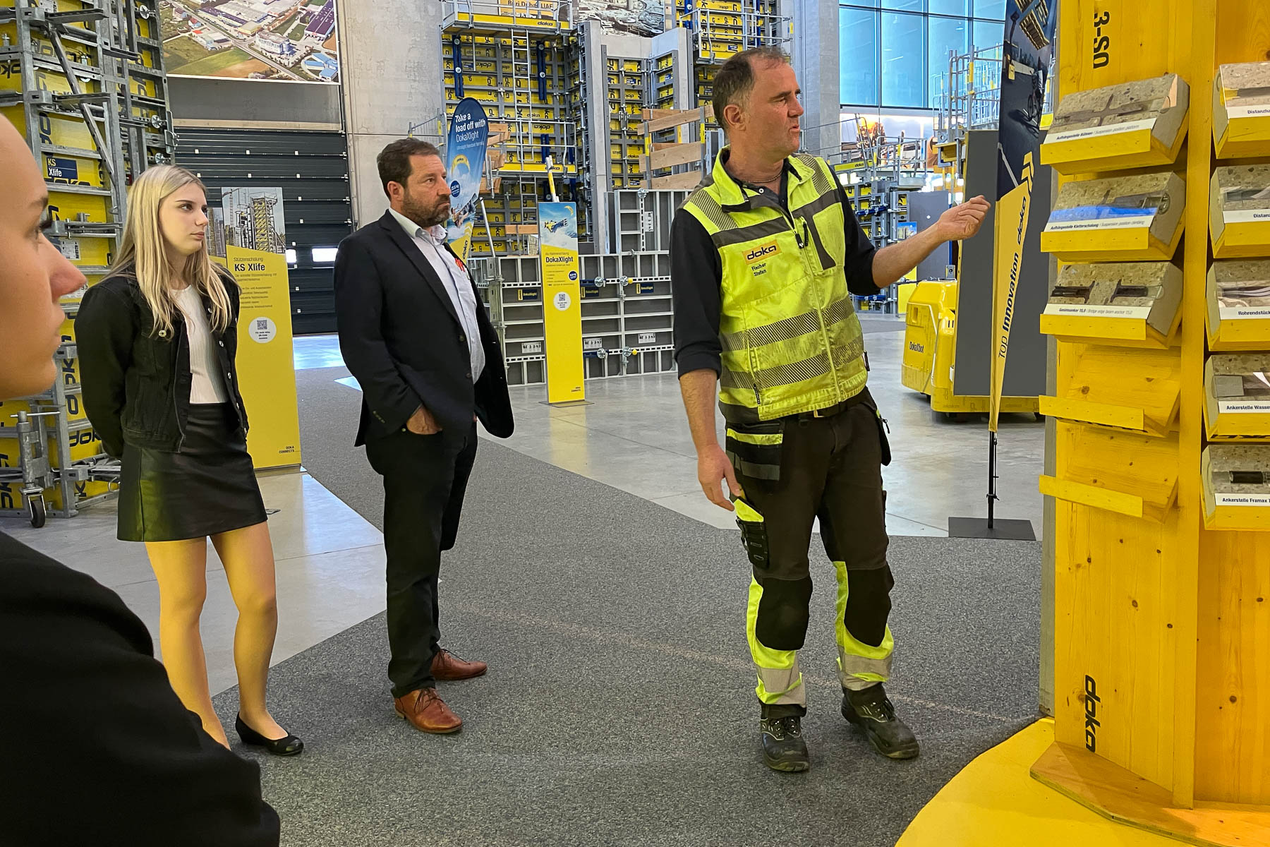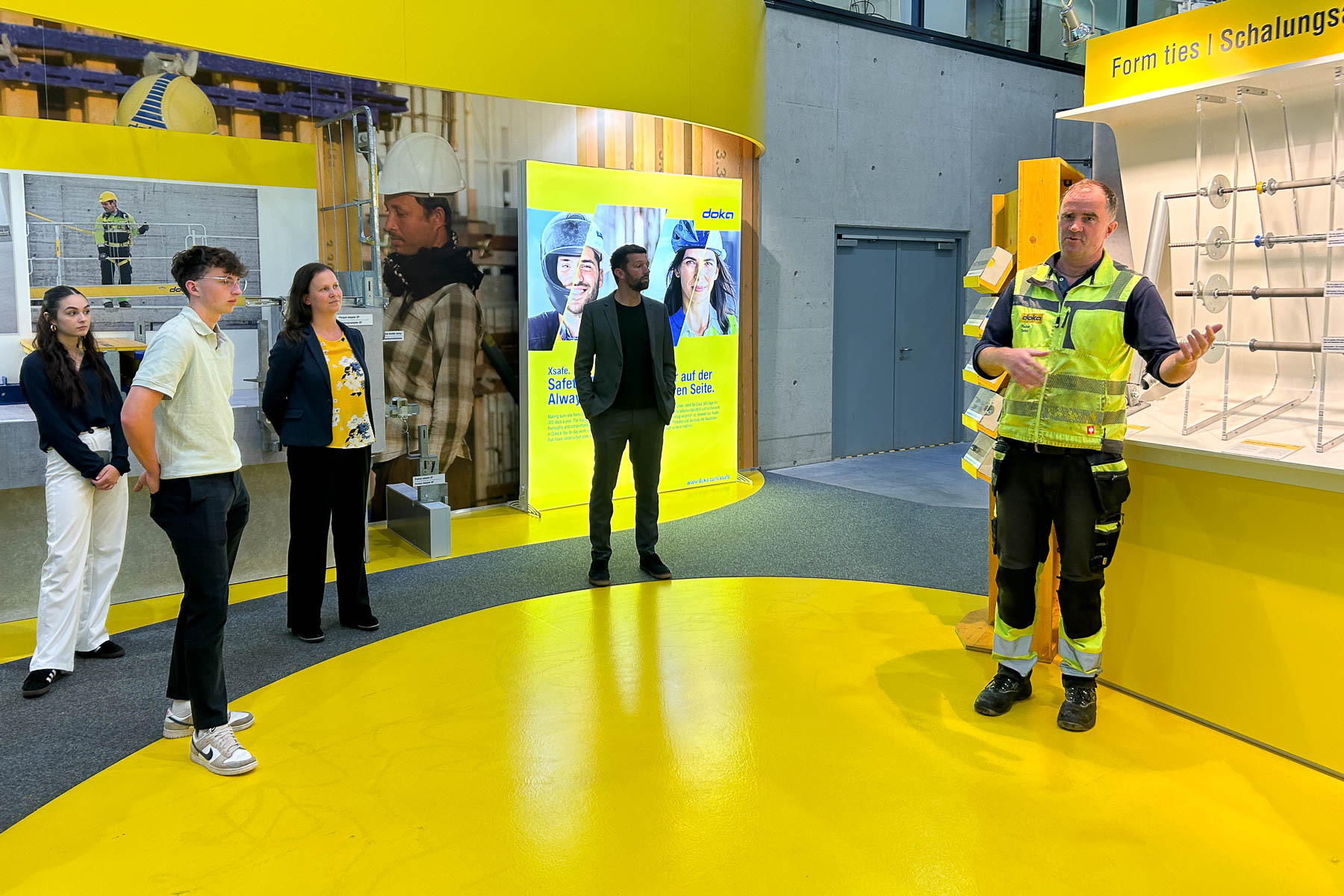 Der Tag begann mit einem herzlichen Empfang durch Mag. Kurt König, der den Anwesenden in einer Präsentation Einblicke in die weltweiten Aktivitäten der Umdasch Group mit ihren verschiedenen Branchen und Geschäftsfeldern gab. Anschließend führte Richtmeister Stefan Fischer die Gruppe durch das beeindruckende “Doka-Forum”. Dort erfuhren die Schülerinnen und Schüler viel über Schalungen und Gerüste, ihre Funktionsweise und die führende Rolle, die die Firma Doka weltweit beim Bau von Wolkenkratzern spielt.