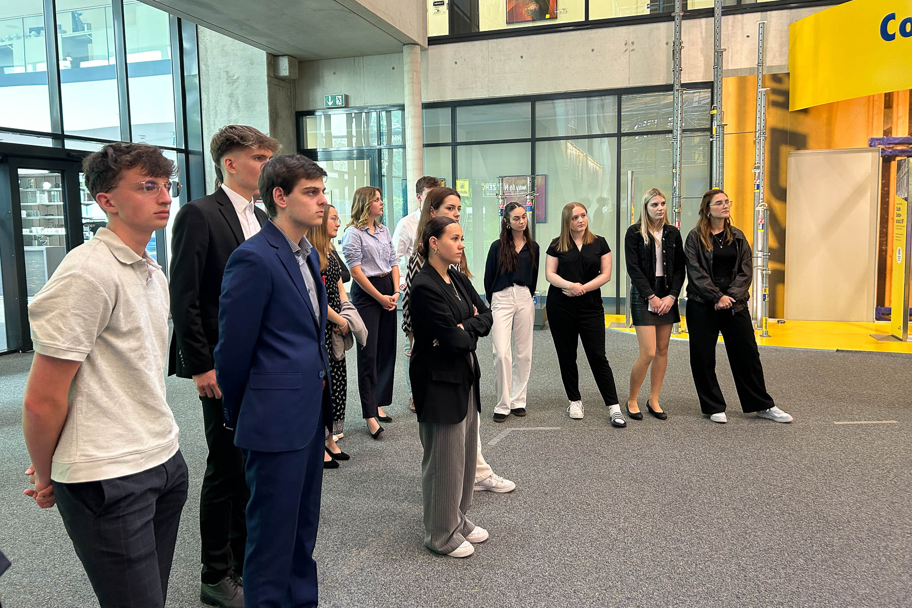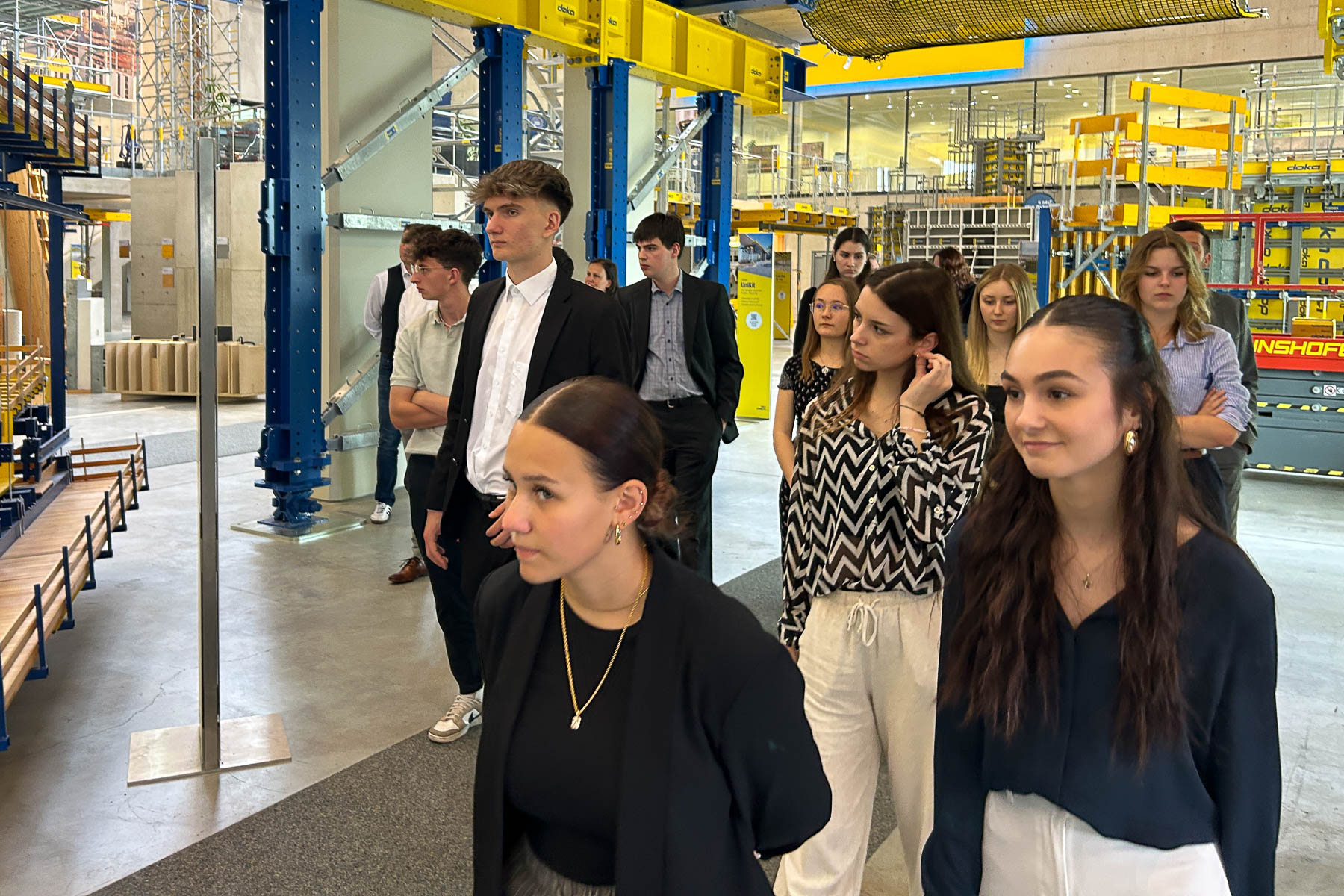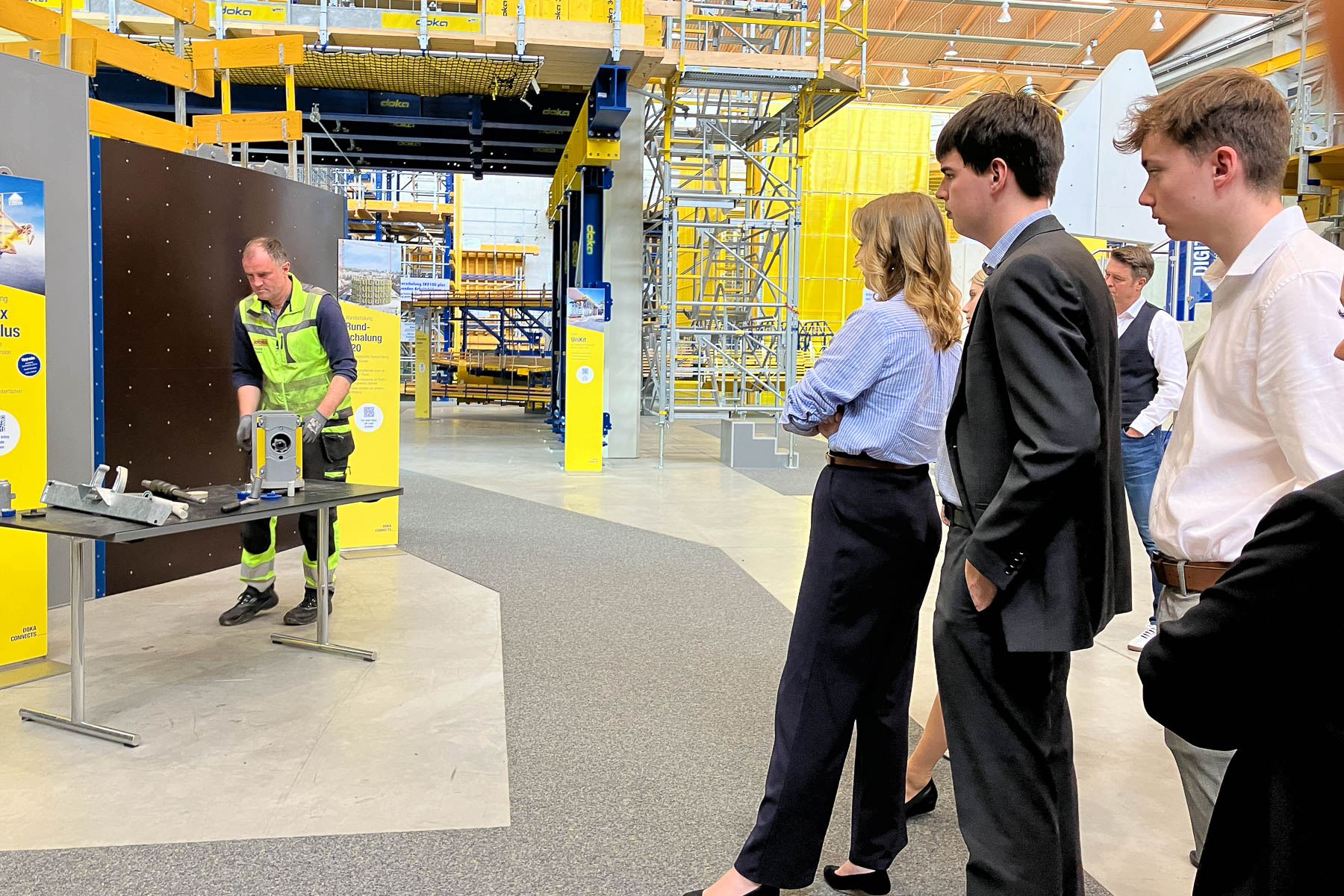 Der Tag begann mit einem herzlichen Empfang durch Mag. Kurt König, der den Anwesenden in einer Präsentation Einblicke in die weltweiten Aktivitäten der Umdasch Group mit ihren verschiedenen Branchen und Geschäftsfeldern gab. Anschließend führte Richtmeister Stefan Fischer die Gruppe durch das beeindruckende “Doka-Forum”. Dort erfuhren die Schülerinnen und Schüler viel über Schalungen und Gerüste, ihre Funktionsweise und die führende Rolle, die die Firma Doka weltweit beim Bau von Wolkenkratzern spielt.