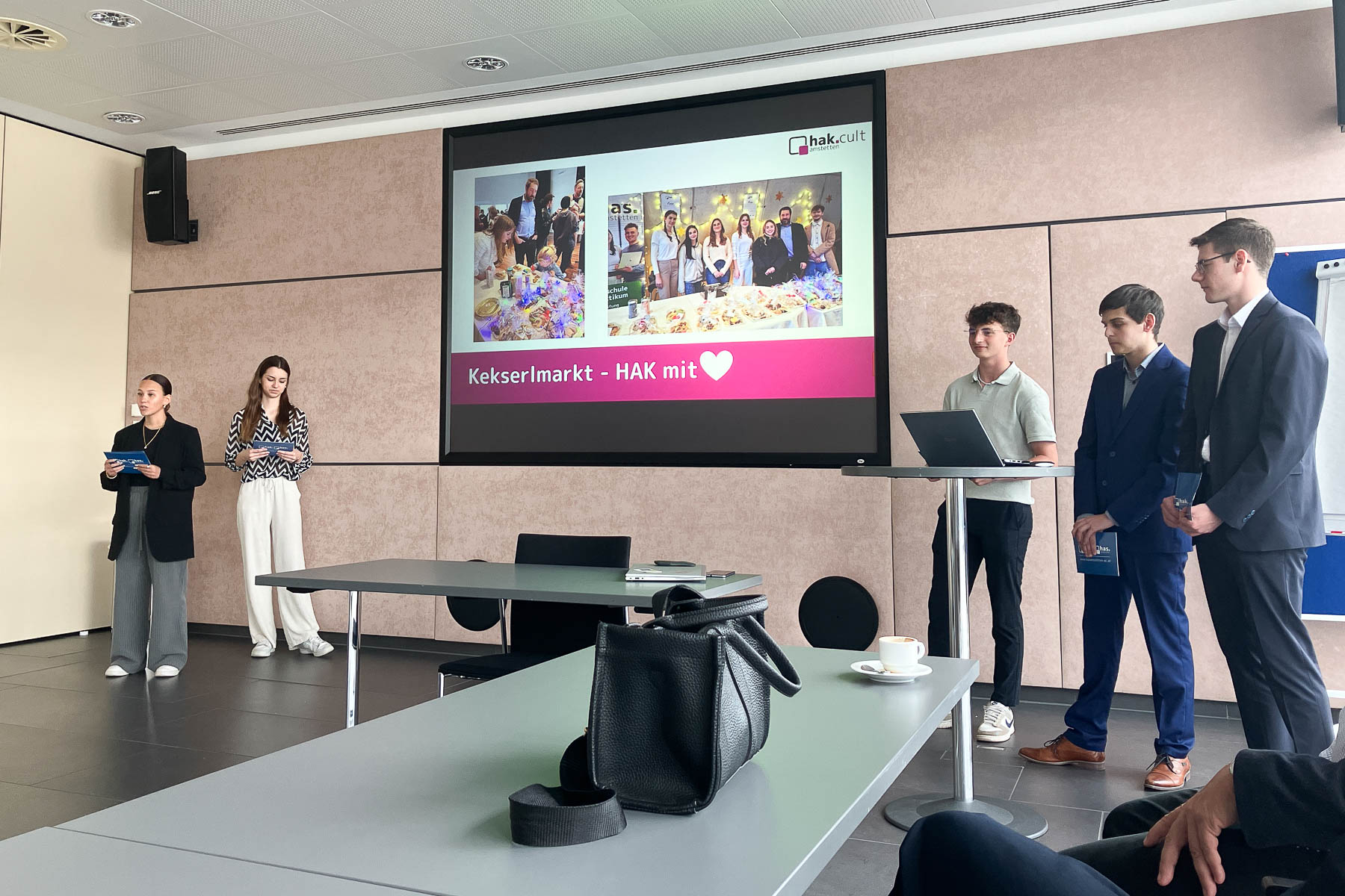 Danach präsentierte ein Teil der Culties die Aktivitäten der vergangenen zwei Schuljahre. Dabei wurden unter anderem die Library Talks, die München-Reise, verschiedene Ausstellungen und Exkursionen vorgestellt. Ein breites Spektrum an Veranstaltungen, das den Schulalltag der rund zwanzig Mitglieder von hak.cult bereichert.