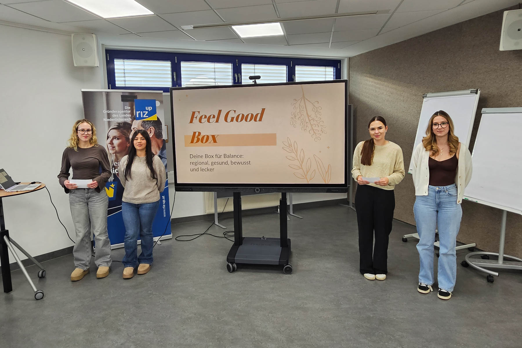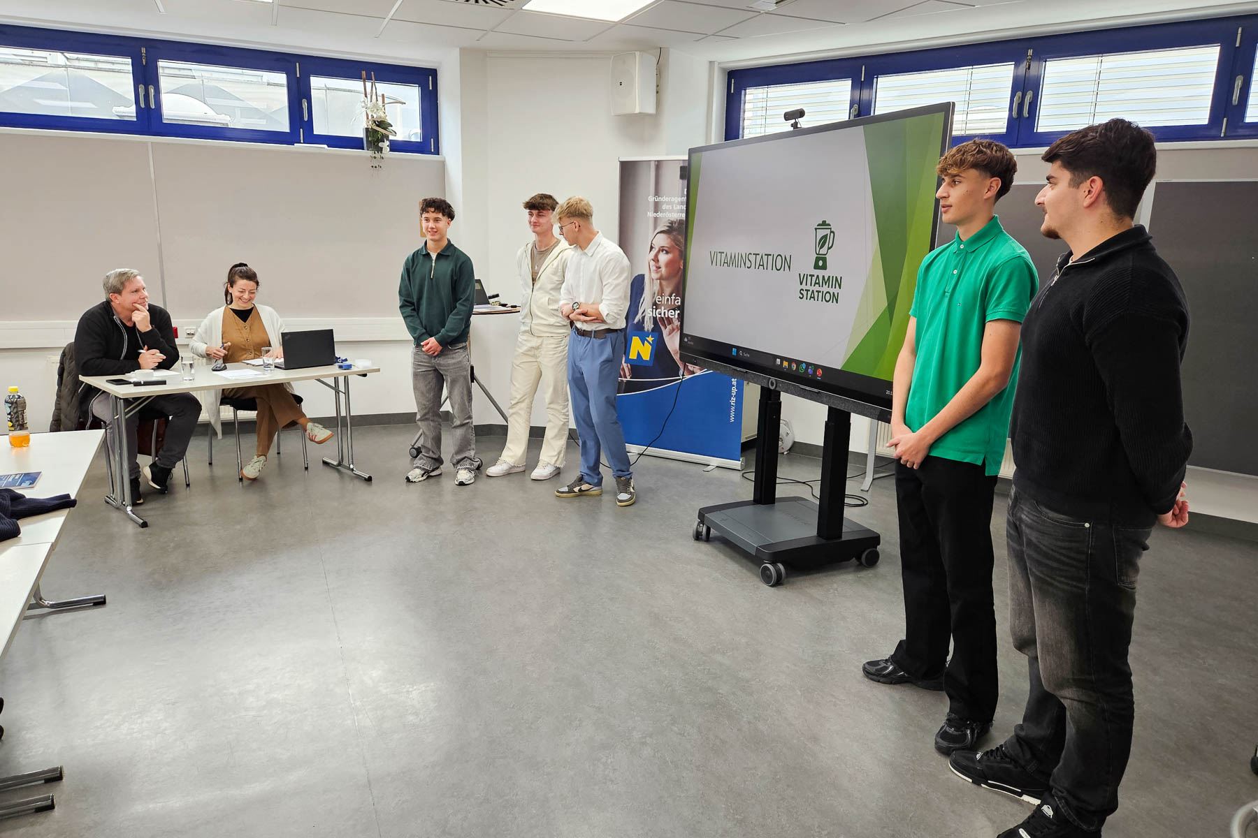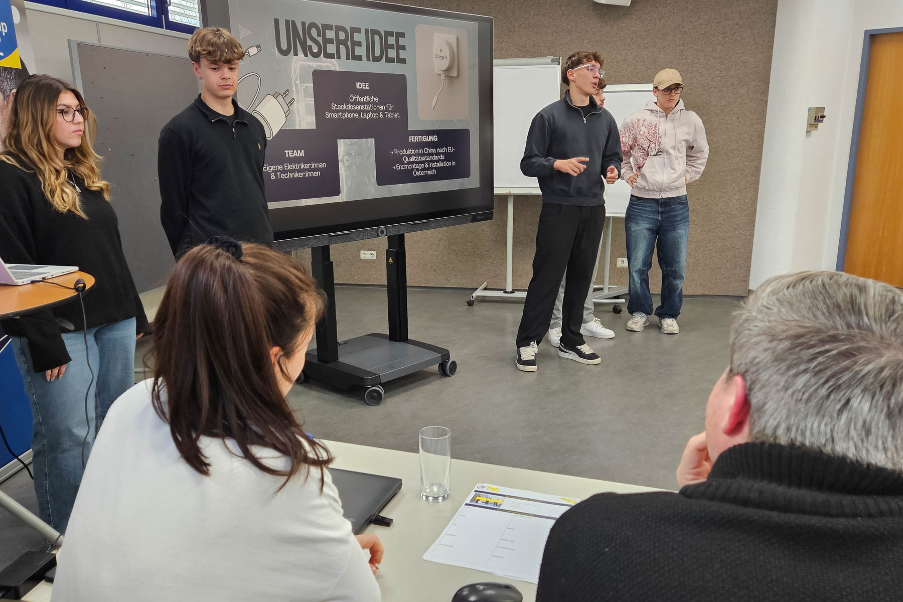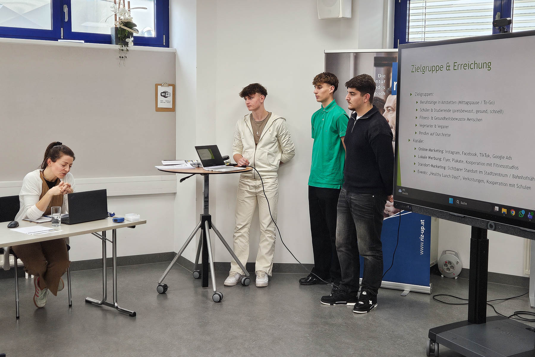 Nach einer kurzen Vorstellung der Aufgaben des RIZ up stellte Ing. Mag. Josef Ritt (Agentur Ritt GmbH) sein Unternehmen vor. Anschließend präsentierten die Schülerteams ihre ausgearbeiteten Geschäftsmodelle: VITAMINSTADEL, CHIPLY, FEEL GOOD BOX, CHARGE IT und KISCHMA