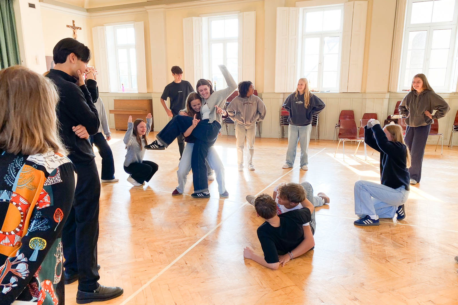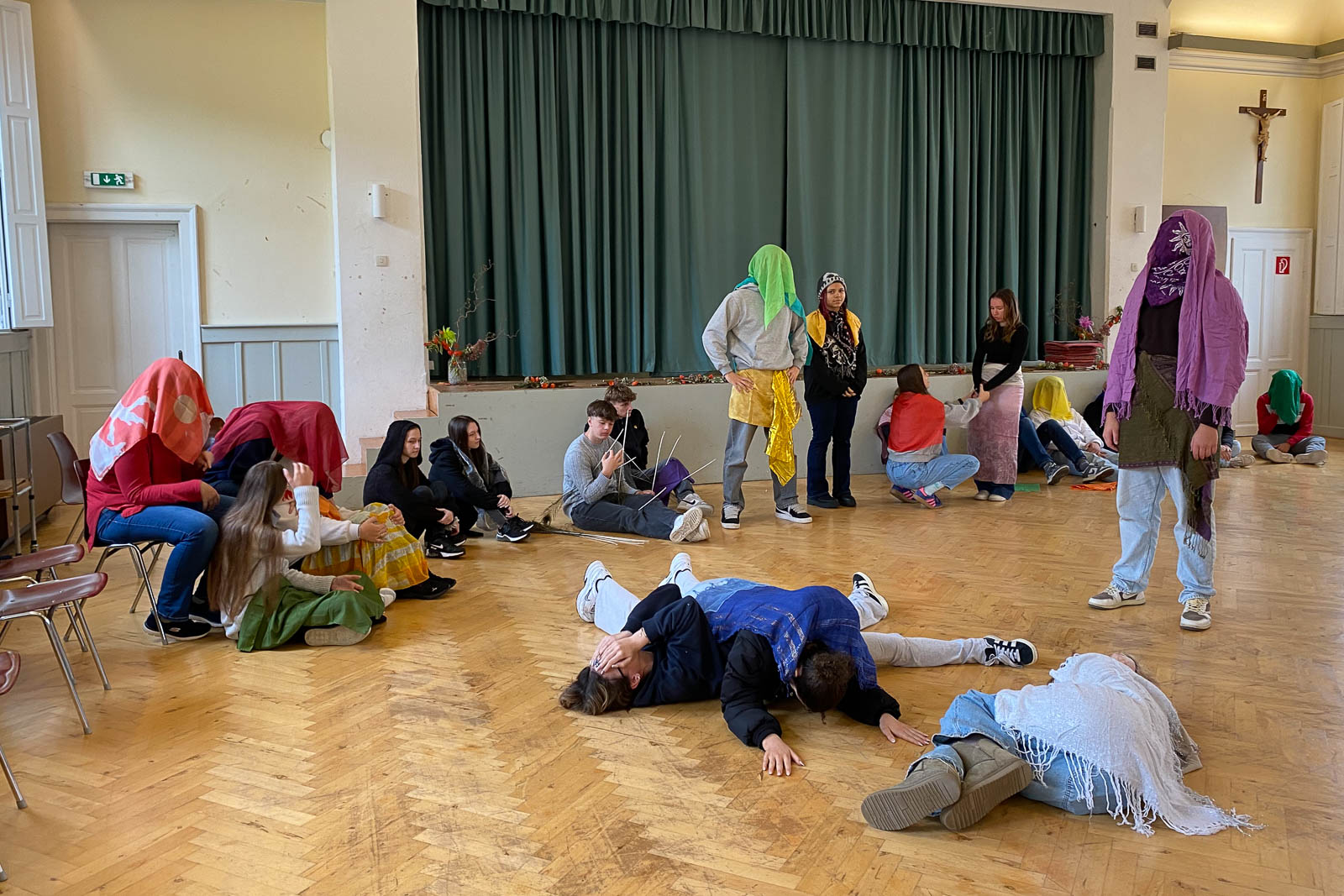 Die SchülerInnen der 4ABK nahmen am 29.9. und 6.10.2025 an einer “Theaterwerkstatt” in der Pfarre Herz Jesu teil. Unter der fachkundigen Anleitung der Theaterpädagogin Carina Baumgartner brachten sie sich spielerisch selbst in Bewegung. Sie probierten verschiedene Rollen aus, ließen sich auf ungewöhnliche Perspektiven ein und gestalteten gemeinsam Szenen.